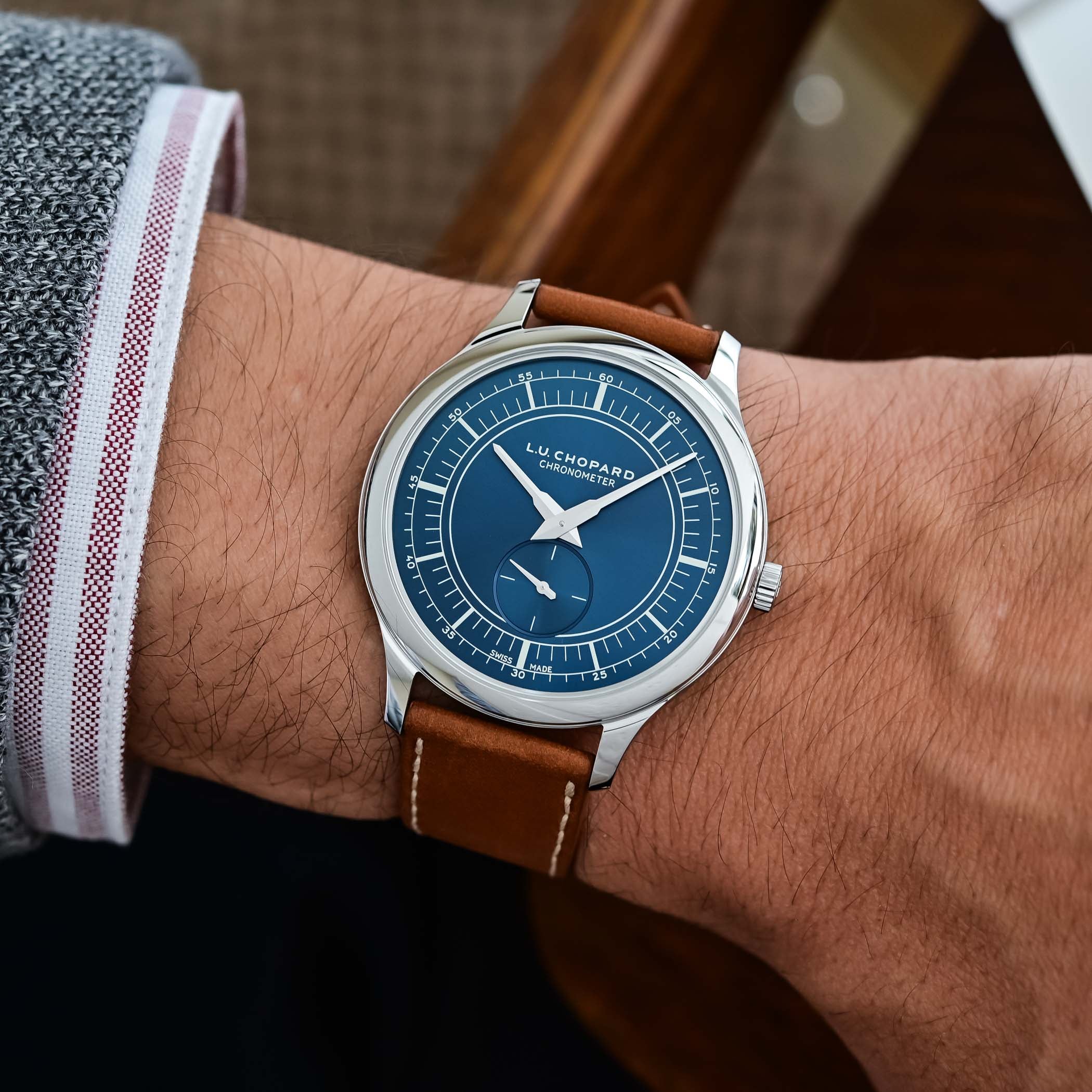 يتم ارتداء الساعة على حزام من جلد العجل باللون البني مع خياطة باللون البني الفاتح، ومغلق بإبزيم من الفولاذ لوسنت. ينضم Chopard LUC XPS Prussian Blue إلى المجموعة العادية بسعر 12900 يورو.