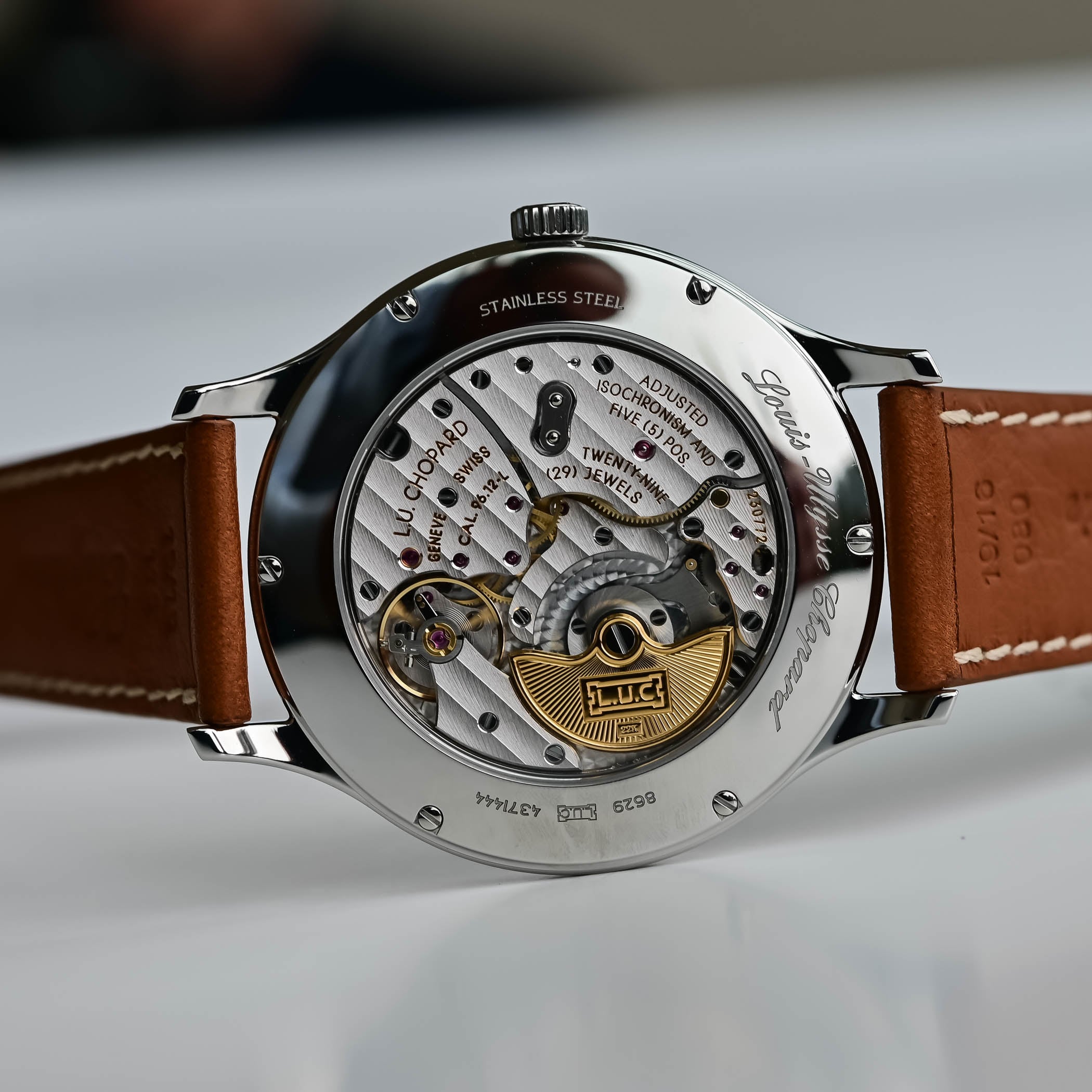 تعمل الساعة بعيار أوتوماتيكي LUC 96.12-L، وهو تطور لأول حركة داخلية للعلامة التجارية، تم تقديمها في عام 1996. يبلغ سمك هذا العيار 3.30 ملم، ويتضمن دوارًا صغيرًا مصنوعًا من الذهب عيار 22 قيراطًا وتقنية Twin من شوبارد مع برميلين مكدسين، مما يوفر احتياطي طاقة لمدة 65 ساعة. الحركة حاصلة على شهادة COSC ولديها آلية إيقاف الثواني لضبط الوقت بدقة. التشطيبات تقليدية مع ديكور Côtes de Genève.