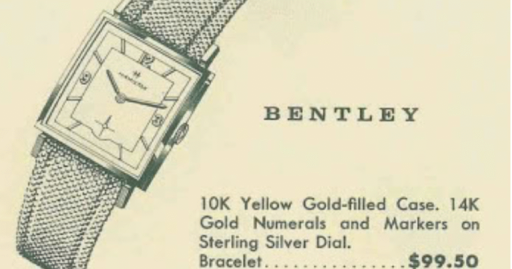 من الأمثلة الجيدة على الطراز متوسط المدى سيارة بنتلي عام 1961. كانت هذه هي المرة الثانية التي يستخدم فيها هاميلتون الاسم، وكانت المرة الأولى في الثلاثينيات. تم إنتاج بنتلي الأخيرة لمدة أربع سنوات. تتميز بعلبة من الذهب عيار 10 قيراط مع قرص من الفضة الإسترليني بلونين مزود بأرقام ومؤشرات صلبة عيار 14 قيراط. هذه ساعة رجالية لطيفة جدًا.