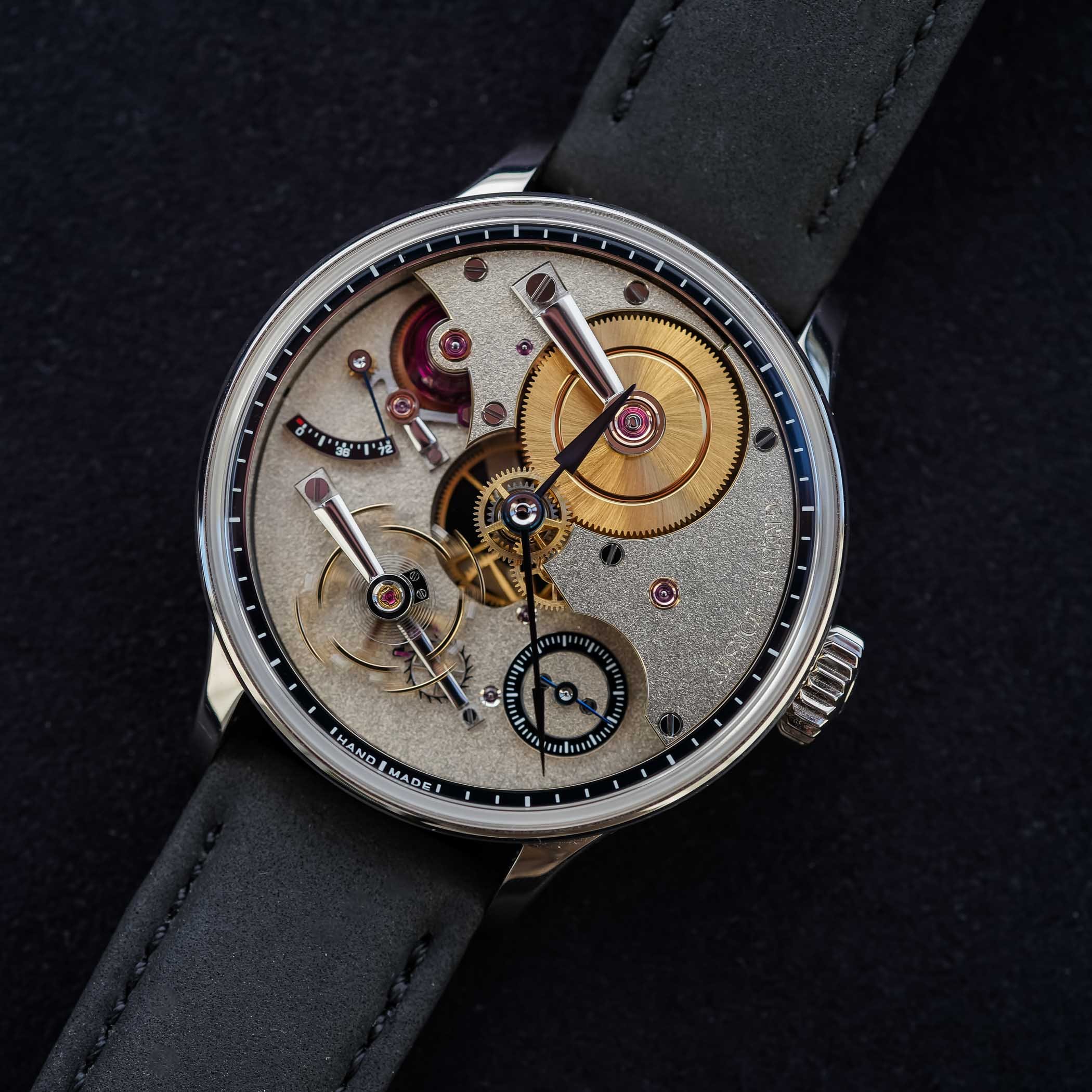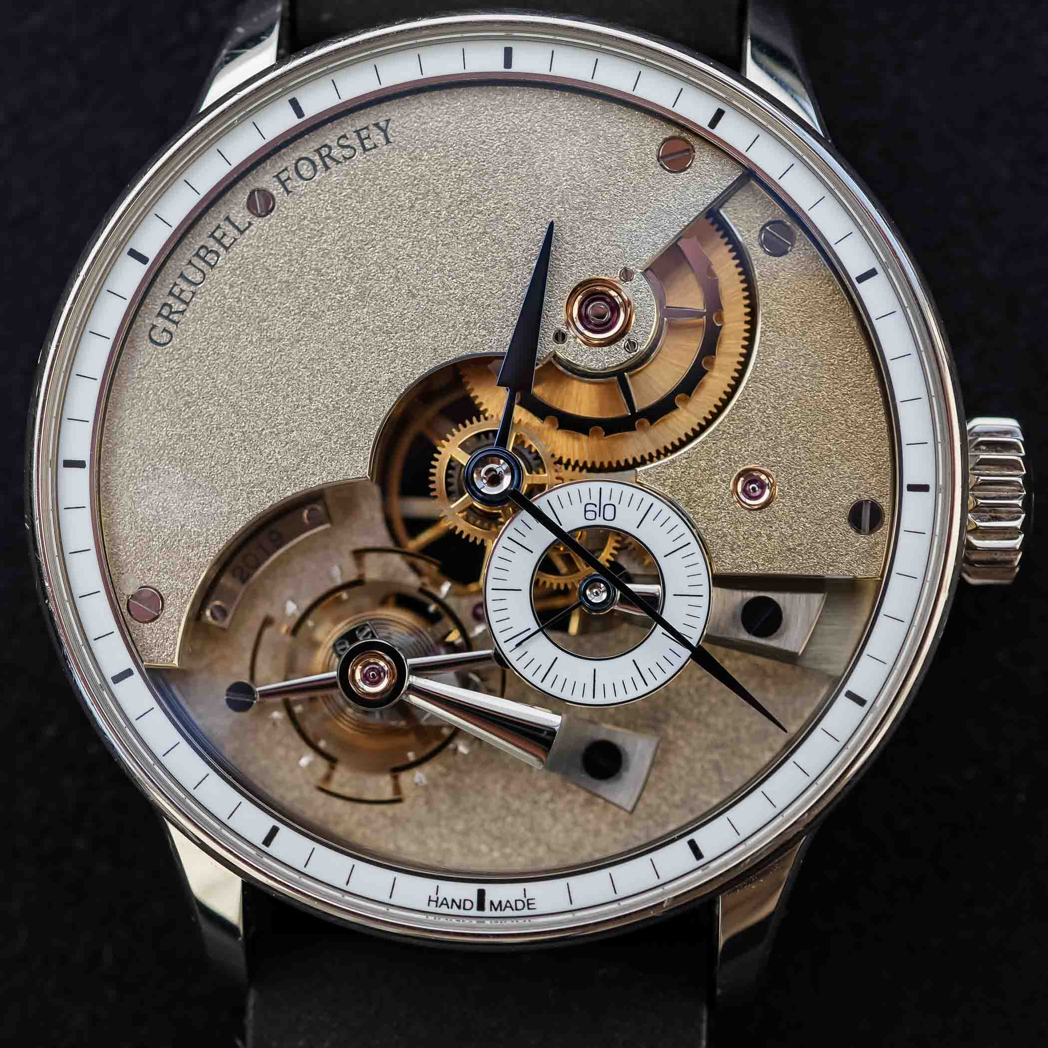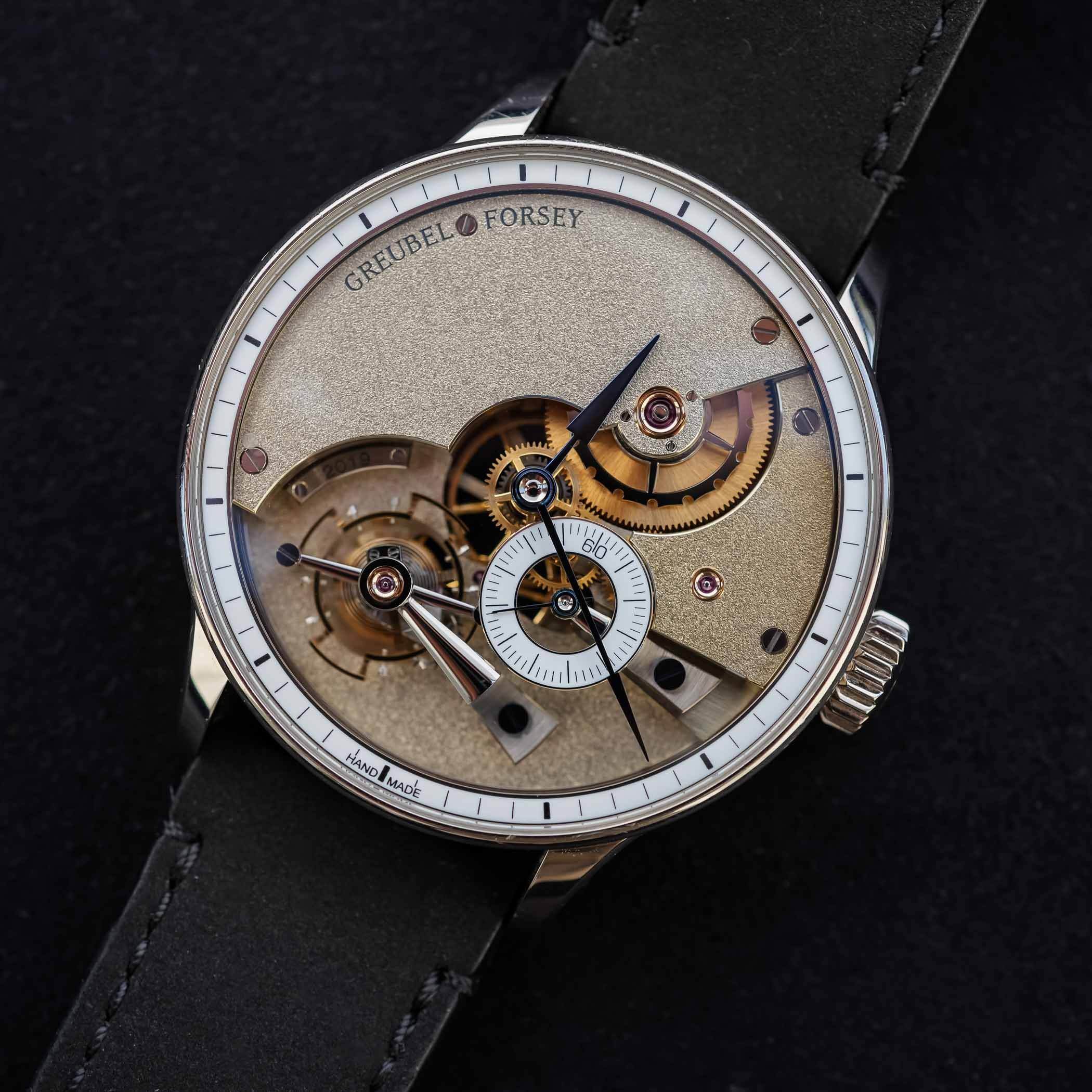 قام Greubel Forsey بإلقاء نظرة واحدة ، للوهلة الأولى ، كلاسيكية تقريبًا ، مع حلقات الفصل المينا والأيدي الزرقاء. يمنحه مساكن أبيض 43.5 مم منفردة 18.5 ملم ، سماكة 13.5 ملم صورة ظلية صامتة تقليدية. ومع ذلك ، يوجد خلف هذا التقييد أحد أكثر المشاريع طموحًا في صناعة الساعات المعاصرة: ساعة بنسبة 95 ٪ يدويًا ، باستخدام الأدوات التقليدية فقط ، ولكنها تم الانتهاء منها وتعديلها مع التحمل من Greubel Forsey الحديثة. من التصميم إلى الانتهاء ، تتطلب كل قطعة حوالي 6000 ساعة من العمل ، أي ما يعادل ثلاث سنوات من ساعات العمل ، ويمكن إنتاج اثنين أو ثلاثة فقط كل عام.