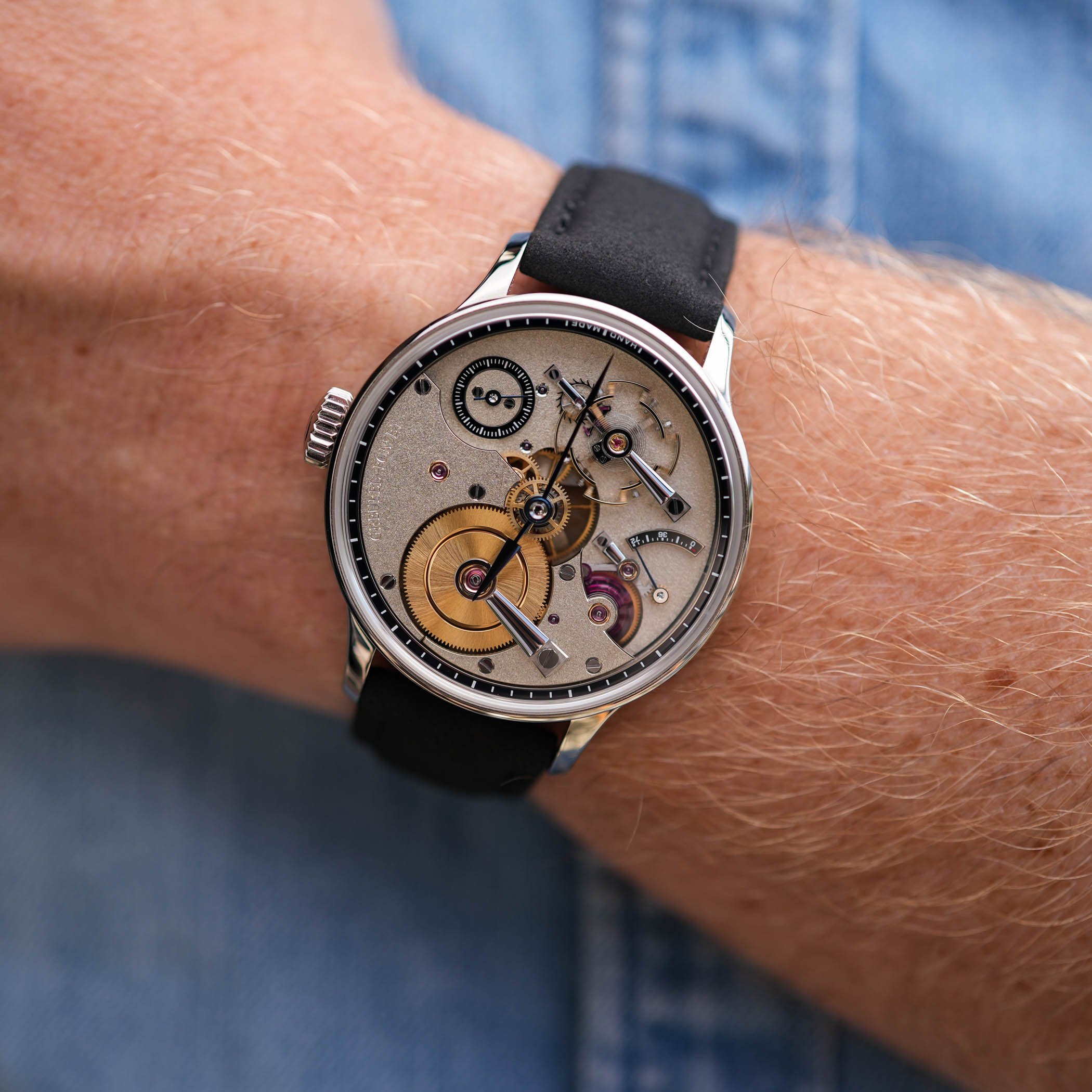 أصغر التفاصيل تتطلب أكبر عمل. قد يتطلب المسمار الفردي ما يصل إلى اثني عشر عملية منفصلة وثماني ساعات لإنهائه ، وتتضمن الساعة 83 منها في 24 اختلافًا. العجلات ، المقطوعة يدويًا والبيتز ، مصقولة بوضوح في يدوي في متناول اليد ؛ تستغرق العجلة وحدها 600 مرة لصنعها أكثر من المكافئ الصناعي. تتميز عجلة العادم ، بقطع الأسنان بالأسنان ، عشرين أسنانًا ، لكل منها أربعة وجوه مصقولة ، ونحت مجهري للتماثل والضوء. حتى جسر البرميل ، الذي تم فحصه باليد على حفر قالب ، يتطلب عمليات سهلة للآلات ولكنها مرهقة لليدين. ينقل البرميل أعمالًا متقاطعة مالطية ، مصقولة باللون الأسود والشامفر ، الوظيفية والزينة.