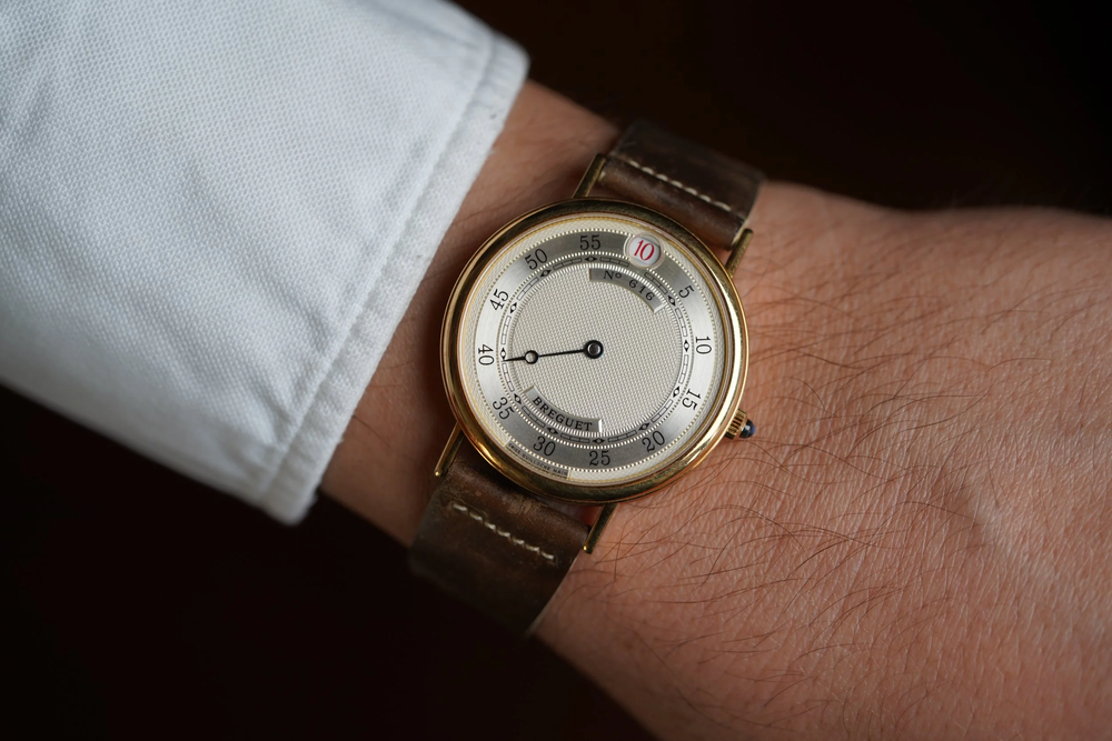 يُعد مرجع Breguet 3620 هذا نسخة أنيقة بشكل لا يصدق من تعقيدات الساعة القافزة. العلبة مصنوعة من الذهب عيار 18 قيراط ويبدو أنها من الذهب الوردي، ولكن قد تكون من الذهب الأصفر المؤكسد. يبلغ قطرها حوالي 36 ملم و43 ملم بين العروات. يتميز بميناء فضي مزخرف بأرقام بريجيت الكلاسيكية. هناك نافذة في الساعة 12 ظهرًا للوقت. هذه ساعات نادرة جدًا ومثيرة للاهتمام. بالنسبة لأولئك الذين لديهم ميل إلى المضاعفات النادرة، لا مزيد من البحث.