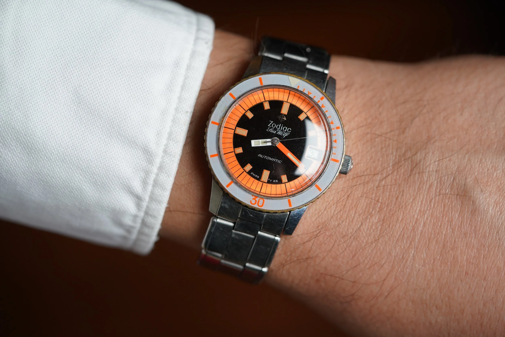 تعد ساعة Zodiac Sea Wolf هذه ساعة كلاسيكية مذهلة بميناء ذهبي “برتقالي غريب”. الساعة مزودة بعيار أوتوماتيكي 72B. يبلغ قطر العلبة 35 ملم (43 ملم بين العروات). يتم إقرانه بسوار Zodiac الذي ربما يكون من صنع C&I وهو قوي جدًا.