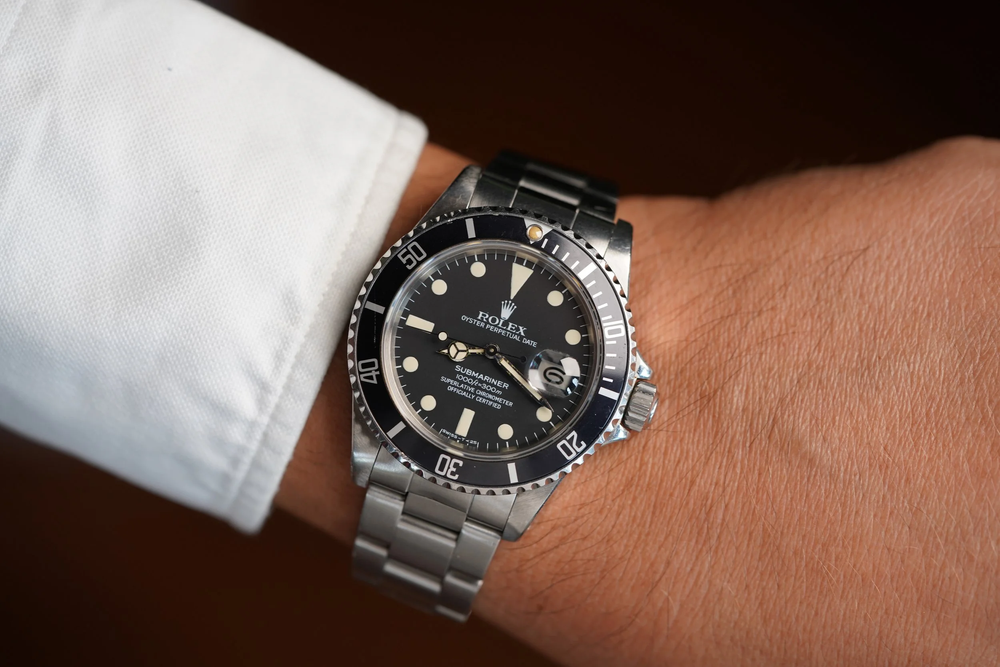 تعد ساعة رولكس صبمارينر واحدة من أشهر الساعات الرياضية على الإطلاق. يحتوي هذا المرجع 168000 على رقم تسلسلي 7.06M يعود تاريخه إلى عام 1981 تقريبًا. ويبدو أن العلبة غير مصقولة. المادة المضيئة للمؤشرات ذات لون شاحب جدًا. ويتميز بقرص انتقالي غير لامع. وهي مقترنة بسوار رولكس أويستر الذي يحمل رمز تاريخ F من حوالي عام 1981.