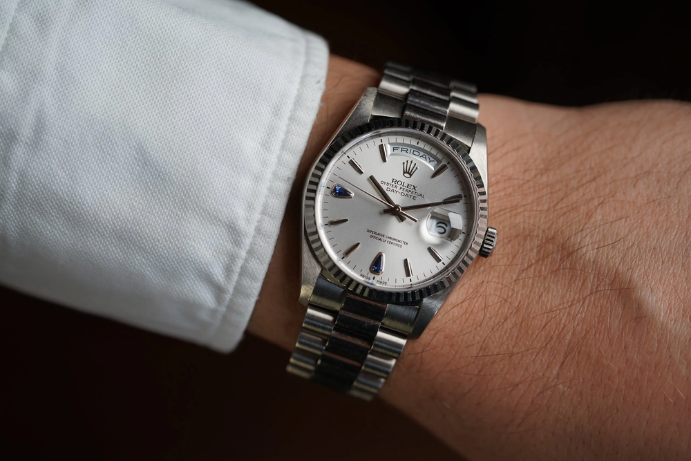 يعد مرجع رولكس داي ديت 18239 مثالًا رائعًا يعود تاريخه إلى عام 1999 تقريبًا. ويتميز بميناء مذهل مع دموع الياقوت عند الساعة 6 و9. علبة الذهب الأبيض في حالة جيدة جدًا وتبدو غير مصقولة. يبلغ قطر العلبة 36 ملم (حوالي 44 ملم من العروة إلى العروة).