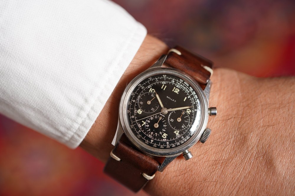 يأتي على سوار Gay Frères الأصلي. هذا المثال عبارة عن كرونوغراف جذاب للغاية. القضية مصقولة بخفة.