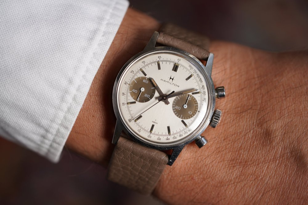 هذه ساعة هاميلتون كرونوغراف جميلة جدًا من أواخر الستينيات، والعلبة غير مصقولة. يتم تشغيله بواسطة عيار Valjoux. اتخذت العدادات لونًا جميلاً.