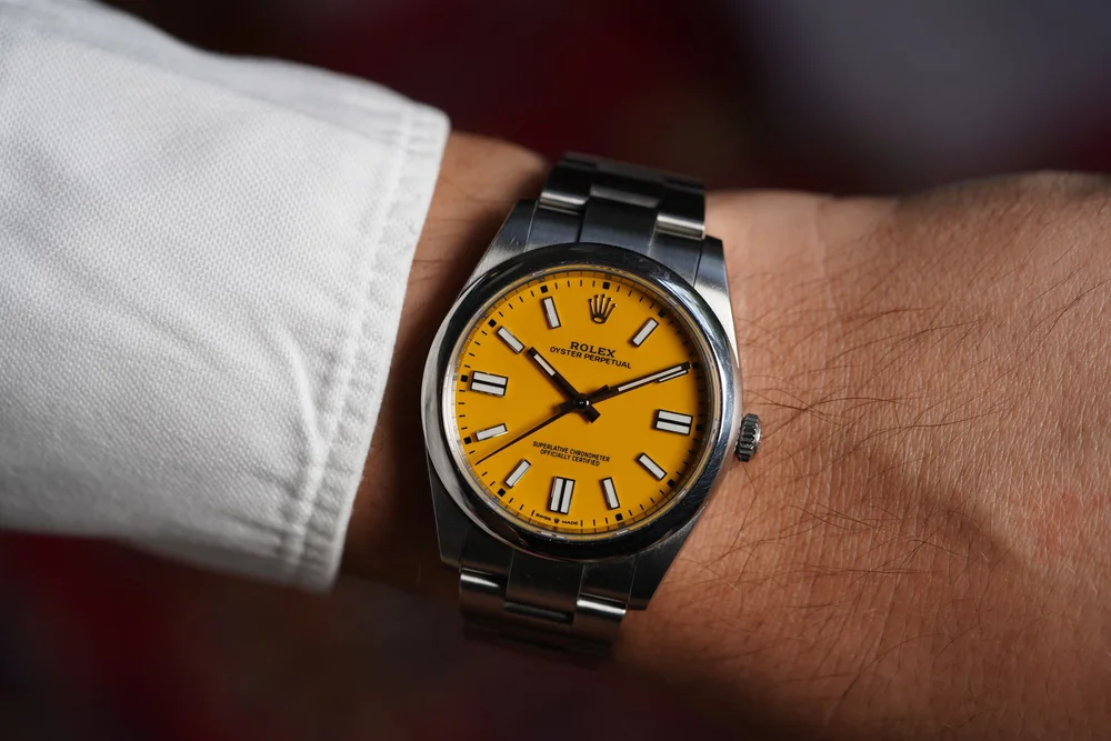 تعتبر ساعة رولكس أويستر بربتشوال 124300 ساعة حديثة رائعة. تتميز بأبعاد رائعة بقطر 41 ملم. يمنحها الإطار الناعم مظهرًا أكثر أناقة قليلاً. الاتصال الهاتفي الأصفر جذاب للغاية. الساعة في حالة جيدة وغير مصقولة.