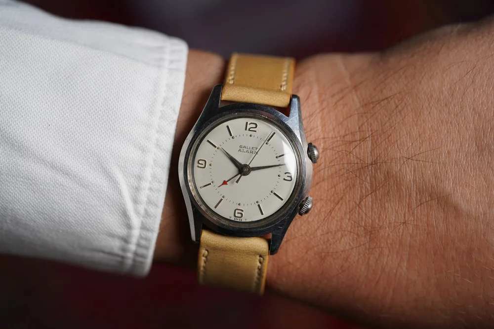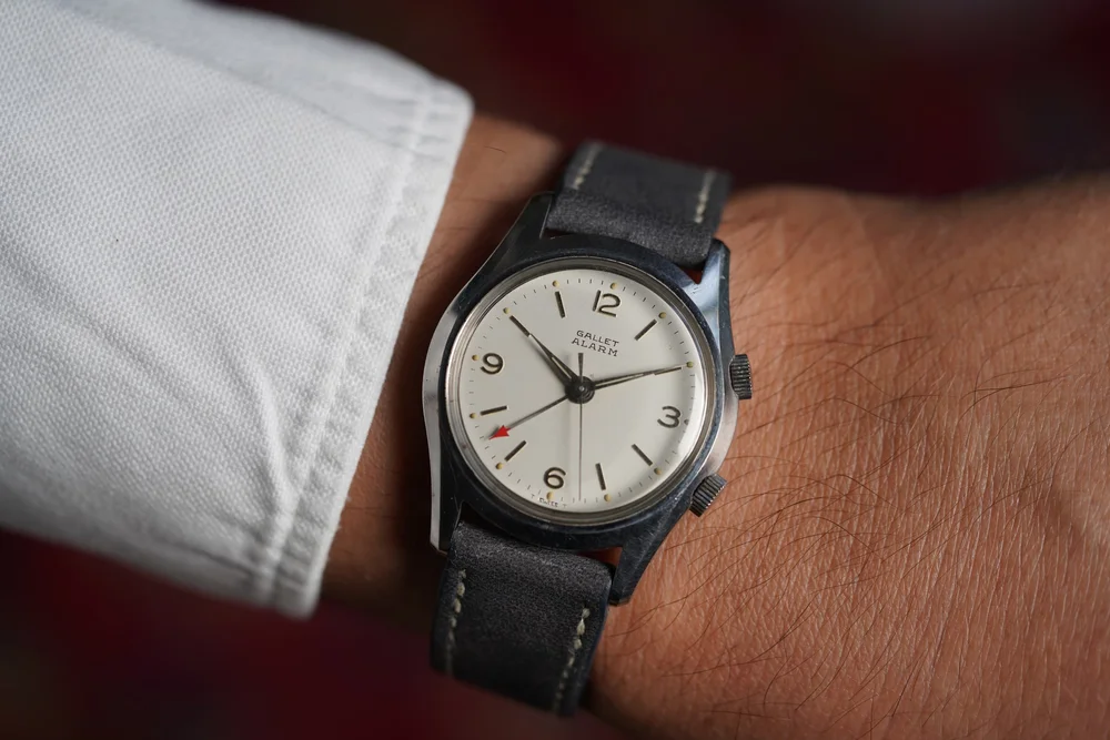 يعد Gallet هذا نموذجًا رائعًا للغاية مع تعقيدات الإنذار. الساعة مدعومة بعيار A. Schilds. يبلغ قطرها حوالي 34 ملم وطولها 41 ملم. المسألة ليست مهذبة.