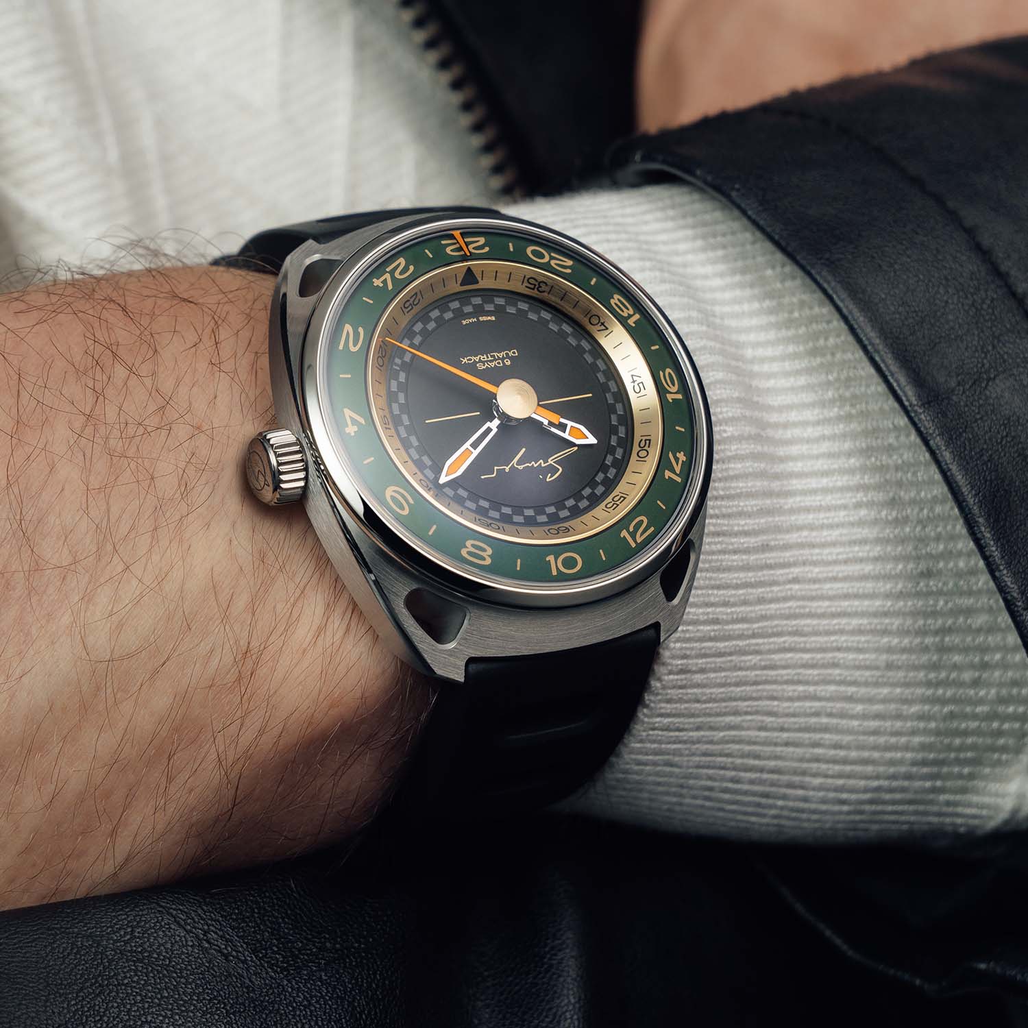 يتناسب DualTrack بشكل مثالي مع لغة تصميم Singer الجديدة مع علبة من الفولاذ المقاوم للصدأ على شكل برميل مقاس 43 مم × 15 مم مع وفرة من الأسطح المصقولة والحواف المصقولة كالمرآة. ومع ذلك، على عكس كرونوغرافات Singer’s Track 1، تتميز العلبة الآن بعروات رياضية مخرمة مع مناطق مقصوصة غائرة. مقاومة للماء حتى عمق 100 متر، ظهر العلبة مثبت بكريستال الصفير لتصور الحركة.