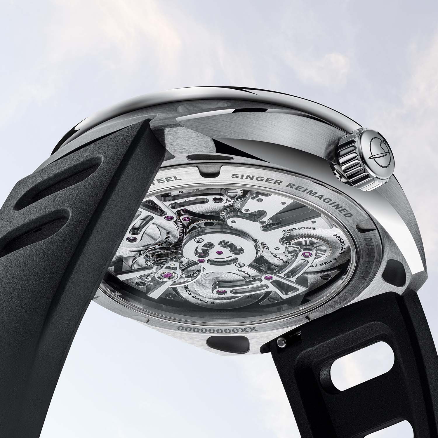 تعمل “مضاعفات الاتصال” الخاصة بالمغني على تبسيط الصيغة من خلال قرص محيطي دوار على مدار 24 ساعة يُظهر وقت المنزل من خلال شاشة الساعة السادسة. مع عدم وجود أقراص فرعية إضافية أو عقارب مركزية إضافية يمكن الخلط بينها في الظلام، فإن حل Singer بسيط بقدر ما هو بديهي. يتم تطبيق هذه الفلسفة نفسها على ضبط العرض، والذي يتم تنفيذه باستخدام مصحح خفي على الجانب الأيسر من العلبة والذي يقدم قرص الـ 24 ساعة بزيادات قدرها ساعة واحدة.