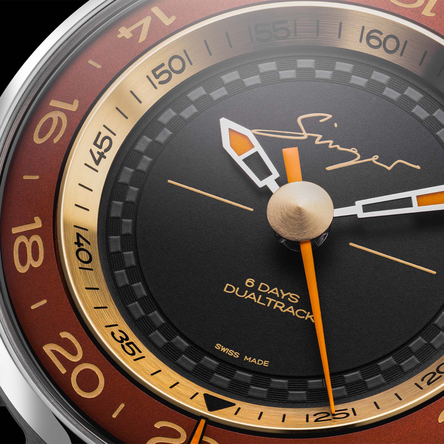 تشتهر Singer Reimagined بإعادة تعريف الكرونوغراف، ولا سيما من خلال سلسلة Track1 الثورية، حيث يحول تخطيط الكرونوغراف المركزي الوقت المنقضي إلى نظرة غريزية. يتم الآن تطبيق النهج المبتكر والبديهي للعلامة التجارية فيما يتعلق بالتعقيدات على أول طراز مزدوج الوقت، وهو DualTrack. ومن خلال إعادة اختراع التعقيدات، يعمل Singer على تبسيط التصميم والإعدادات ويحافظ على وظائفه عاملة بفضل العيار 4 الخاص به واحتياطي الطاقة المثير للإعجاب لمدة ستة أيام.